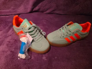 Zapatillas Adidas Samba con un diseño clásico y moderno. - Combinación de colores blanco y turquesa. - Cordones adicionales blancos incluidos. - 1 solo uso