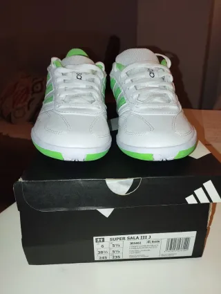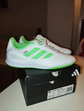 PREGUNTAR PRIMERO!! Zapatillas de fútbol sala Adidas. Tienen 10 días, no somos capaces de devolverlas. Hemos tirado la etiqueta que viene atada a cordones. Adjunto foto de la factura. - Modelo Super Sala III J. - Color blanco con detalles en verde lima. - Suela de goma para mayor agarre.