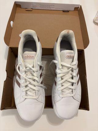 Zapatillas casuales de Adidas para mujer, con detalles en tono plateado con reflejo rosa - Exterior blanco. - Tres rayas laterales en color plateado-rosado. - Cierre con cordones blancos. - Detalle del logo en la lengüeta y el talón. El único desperfecto que tienen son las manchas en la zona interior que se muestran en las fotos.