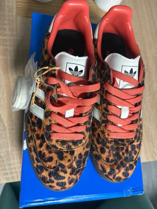 Zapatillas Adidas Samba con estampado de leopardo y detalles en naranja. Vienen con su etiqueta original. - Diseño llamativo con estampado de leopardo. - Cordones y forro interior en color naranja. - Tres rayas blancas características de Adidas.