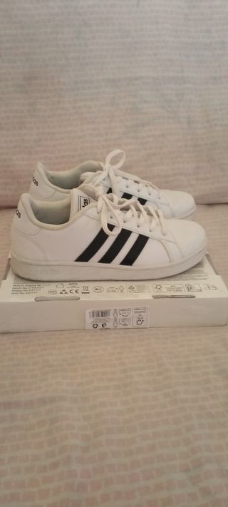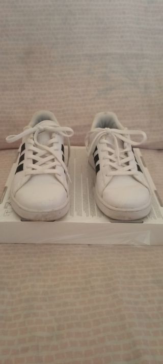 Zapatillas deportivas Adidas en color blanco.aunque marca dentro una talla 47, es más pequeño. Una 46. - Diseño con tres franjas laterales. - Cierre con cordones. - Costuras detalladas en la parte delantera.