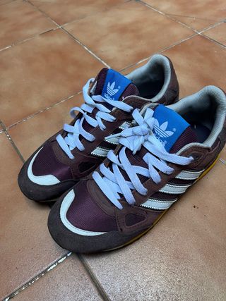 Zapatillas deportivas Adidas con un diseño moderno y cómodo. - Combinación de colores marrón y morado. - Detalle de las tres franjas blancas. - Cordones blancos.