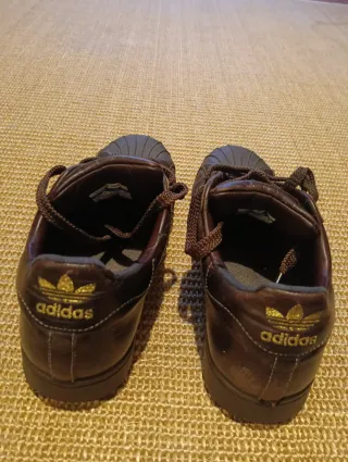 Zapatillas Adidas de cuero en color marrón con detalles dorados. - Material exterior de cuero. - Diseño clásico de Adidas.