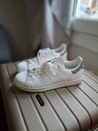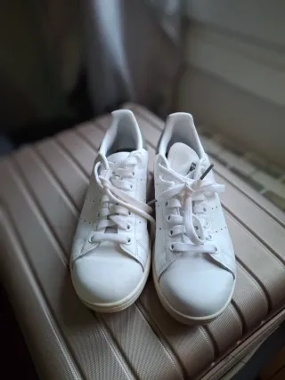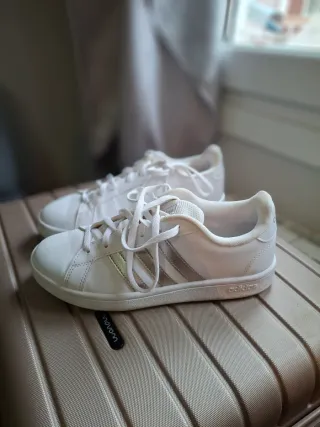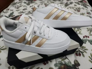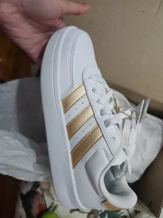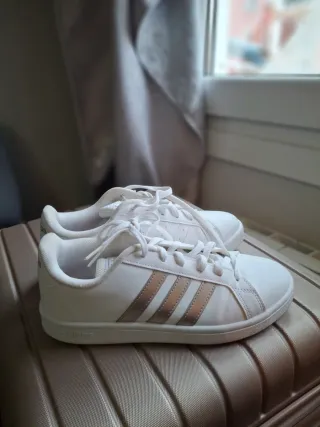 Zapatillas Adidas sin estrenar, con un diseño moderno y cómodo. - Combinación de colores beige y blanco. - Cierre con cordones. - Detalle de las tres rayas icónicas de Adidas. Talla 37 1/3. Se hacen envíos, No negociable