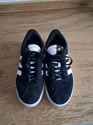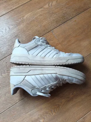Zapatillas deportivas Adidas unisex con un diseño moderno y deportivo. - Parte superior de malla transpirable. - Tres rayas icónicas de Adidas en los laterales. - Suela de goma para mayor durabilidad. - tiene un poco de desgaste dentro por usar que no enfecta nada ver fotos.