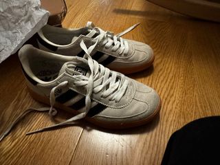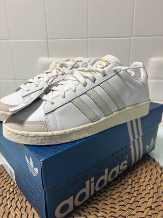Zapatillas de vestir Adidas en color blanco con detalles en beige. Muy bonitas para look casual. Algo negociables. - Diseño clásico de Adidas. - Cordones blancos. - Suela de goma.