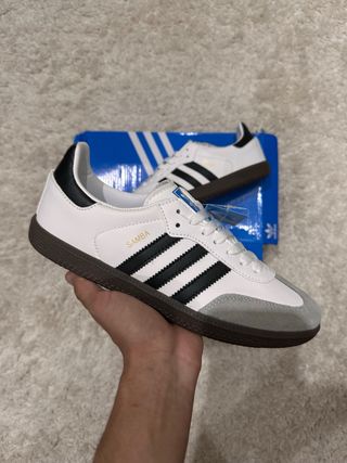 Clásicas zapatillas Adidas Samba con un diseño atemporal. - Parte superior de cuero blanco. - Rayas laterales negras. - Detalle de gamuza en la puntera. - Suela de goma. - Cierre con cordones. - Plantilla Ortholite