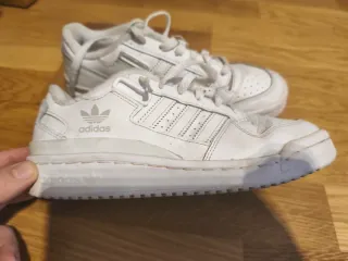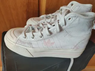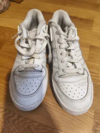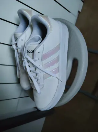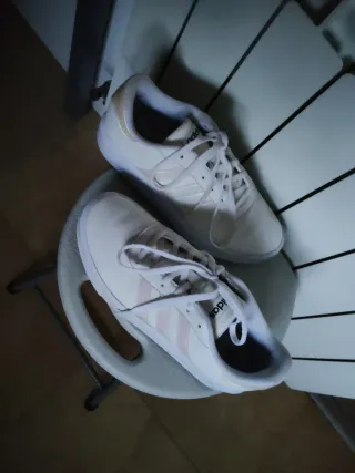 Zapatillas deportivas Adidas de color blanco. - Diseño clásico y versátil. - Cierre con cordones para un ajuste seguro. - Detalle de las tres rayas icónicas de la marca. Están usadas pero en muy buen estado.
