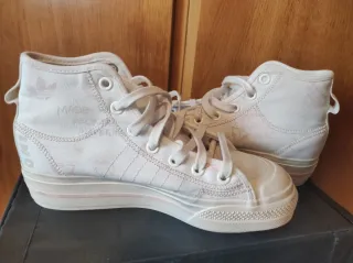 Zapatillas Adidas en muy buen estado, con un diseño clásico y versátil. - Color beige con detalles en blanco. - Materiales de calidad. - Suela de goma.