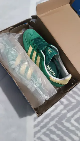 Vendo un par de zapatillas Adidas Spezial de color verde. Son de ante y tienen las tres rayas características de Adidas en blanco. La suela es marrón. Están en muy buen estado. - Modelo Spezial - Suela de goma - Material de ante
