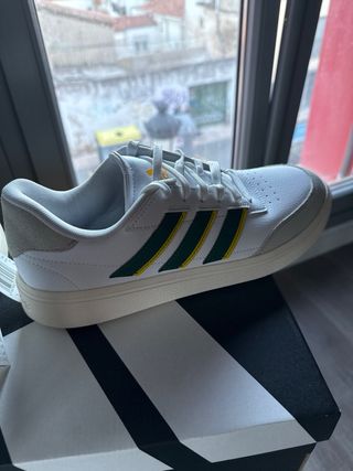 Zapatillas deportivas Adidas Courtblock en color blanco con detalles verdes. - Diseño clásico y versátil. - Tres rayas laterales icónicas de Adidas. - Suela de goma para mayor durabilidad.