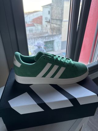 Zapatillas Adidas Grand Court 2.0 en color verde con detalles blancos. - Diseño clásico y versátil. - Tres rayas icónicas en los laterales. - Suela de goma para mayor durabilidad.
