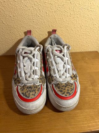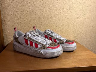 Zapatillas deportivas Adidas con un llamativo estampado de leopardo. - Diseño multicolor con detalles en rojo. - Cordones blancos. - Tira trasera con rayas rojas y blancas. - Precio negociable.