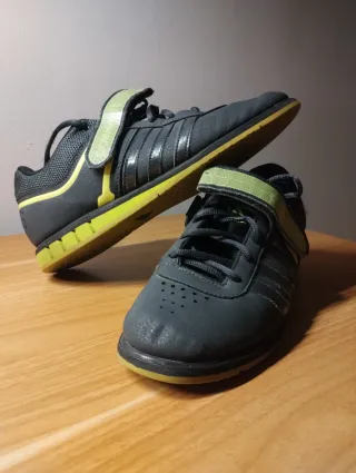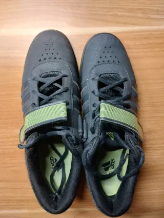 Zapatillas de powerlifting Adidas con un diseño llamativo. La es un 42 2/3 - Cierre de velcro para un ajuste seguro. - Suela elevada para mayor estabilidad. - Detalles en color amarillo brillante. Tienen uso, pero están en un estado aceptable. A nivel visual solo tienen un poco rozada la zona del talón