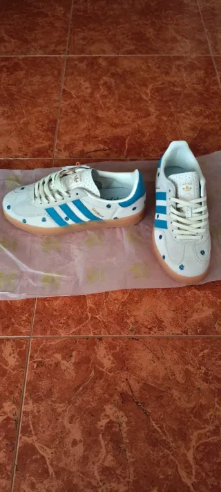 Zapatillas Adidas Gazelle en talla 40 2/3. Un clásico deportivo con un diseño llamativo. - Diseño con las icónicas tres franjas. - Detalle de color turquesa en las franjas y el talón. - Material de ante suave al tacto. -usadas pero con mundo por delante -auténticas,se envían con su caja No hago envíos por Correos