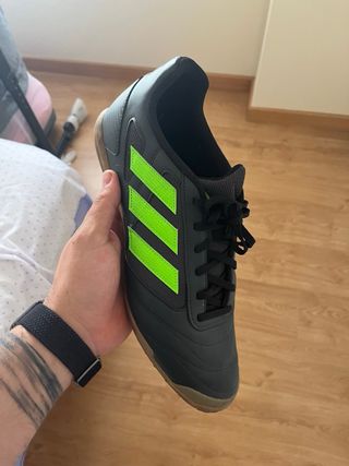 Vendo zapatillas Adidas de fútbol sala. Ideales para jugar en pistas cubiertas. Son de color negro con detalles en verde lima. - Diseño deportivo y cómodo. - Suela de goma para un buen agarre. - Perfecto estado. -Solo usadas una vez.