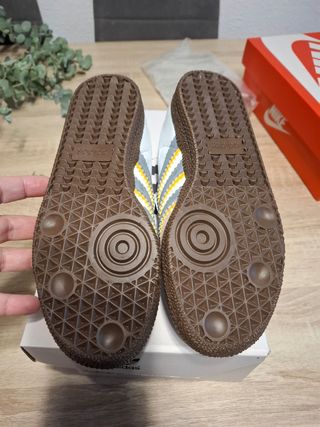 Zapatillas Adidas Samba OG, talla 44, en color blanco y negro. Ideales para un look casual y deportivo. - Cuentan con las tres rayas características de Adidas. - Suela de goma. -totalmente nuevas sin usar