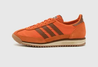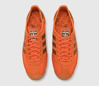Zapatillas Adidas de estilo deportivo. - Color naranja vibrante. - Detalles en marrón. - Diseño clásico de Adidas.
