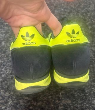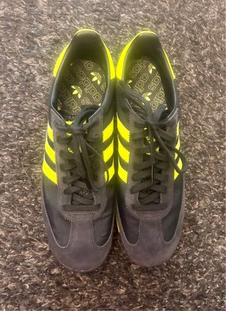 Zapatillas deportivas Adidas con un llamativo diseño. - Combinación de colores negro y amarillo. - Detalle de las icónicas tres rayas de Adidas. - Logo de Adidas en la plantilla interior. Talla 44 2/3 Usadas en una ocasión