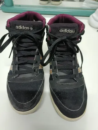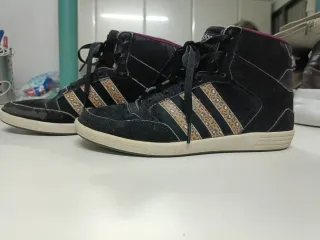 Zapas Adidas altas en negras y lilas con motivos laterales en leopardo. Usadas,aunque todavía creí q pueden tener una segunda vida!! En algunos sitios como una puntera y algún lateral un poquito rozadas,pero ya se ven q es lo mínimo!! Precio negociable!!! Aprovechad chic@s!! altas de la marca Adidas en color negro con detalles morados. - Cierre con cordones negros. - Detalle de estampado animal en los laterales. - Cuello acolchado para mayor comodidad.