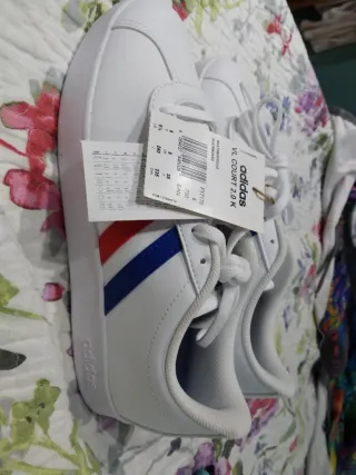 Zapatillas deportivas Adidas VL Court 2.0 K. - Modelo: FY7170 - Talla: 38 (240 CHN / 236 EUR) - Diseño con detalles en rojo y azul.