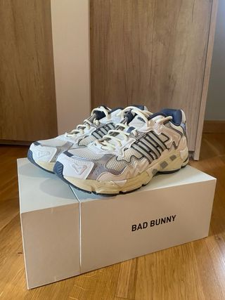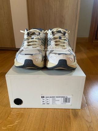Zapatillas Adidas Response CL x Bad Bunny en muy buen estado. Combinan tonos grises y blancos con detalles distintivos. - Diseño deportivo y moderno. - Cordones blancos. - Suela de goma. - Logo de Bad Bunny en la caja. - Originales comoradas en Stockx