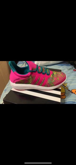 Zapatillas deportivas de la marca Adidas. - Diseño en color beige con detalles en rosa. - Tres rayas blancas características en el lateral. - Logo de Adidas en la plantilla y en el exterior. -Dinero en mano o bizum