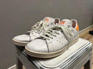Zapatillas Adidas Stan Smith con detalles en naranja. - Exterior de cuero blanco. - Detalle naranja en el talón. - Cierre con cordones. - Algo usadas (mirar fotos).