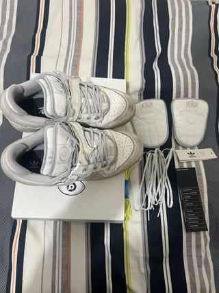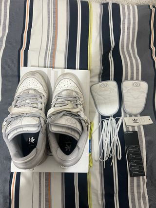 Zapatillas Adidas Forum x Bad Bunny en color gris y blanco. Incluyen accesorios. - Cordones adicionales. - Plantillas de repuesto. - Etiquetas originales.