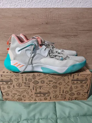 **(más modelos en perfil, cogiendo varias hago pack más baratas)** Zapatillas de baloncesto Adidas en talla 15 US (equivalente a 50 2/3 FR o a un 49 EU). Diseñadas para ofrecer comodidad y rendimiento en la cancha. - Combinación de colores blanco y turquesa. - Detalles en coral en el interior y tiradores.