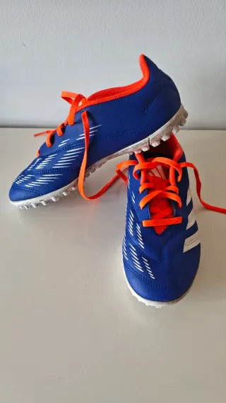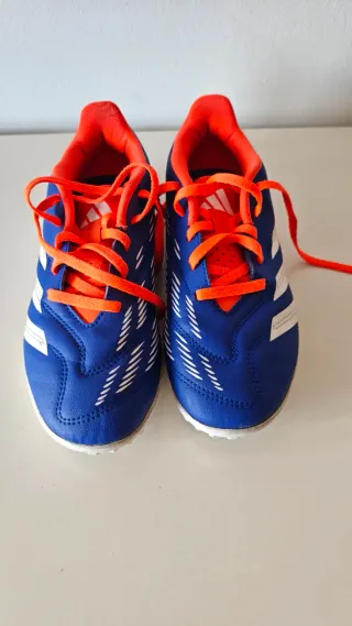 Zapatillas de fútbol Adidas Predator en llamativos tonos azules y naranjas. Perfectas para la práctica deportiva. - Diseño con detalles blancos. - Cordones naranjas. - Interior naranja. Talla 37 1/3. Tienen de uso tres semanas