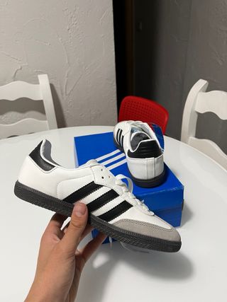 Zapatillas Adidas Samba Originals en blanco y negro. Un clásico atemporal. - Diseño icónico con las tres franjas. - Detalle de ante en la puntera. - Cierre de cordones. Precio negociable.