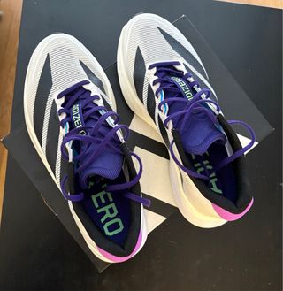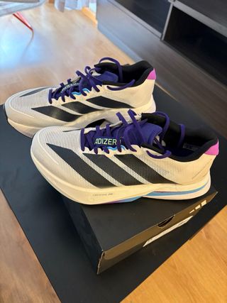 Zapatillas deportivas Adidas Adizero Boston 13. - Diseño en blanco con detalles en morado y negro. - Suela con tecnología Lightstrike Pro. Solo tienen una salida de 8km, las vendo porque no me van bien.