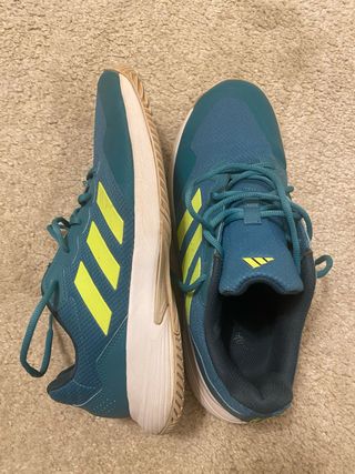 Zapatillas de tenis Adidas Gamecourt 2 en llamativos tonos teal y amarillo. Las vendo porque me quedan pequeñas . - Diseño deportivo. - Tres rayas icónicas de Adidas en los laterales. - Cordones para un ajuste seguro.