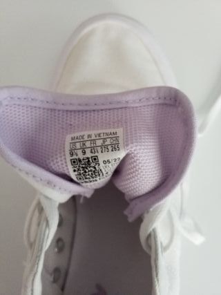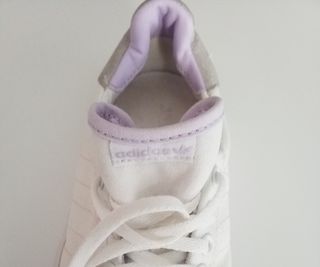 Zapatillas de tenis Adidas en talla 38. - Diseño en blanco y tonos lilas. - Cierre con cordones.
