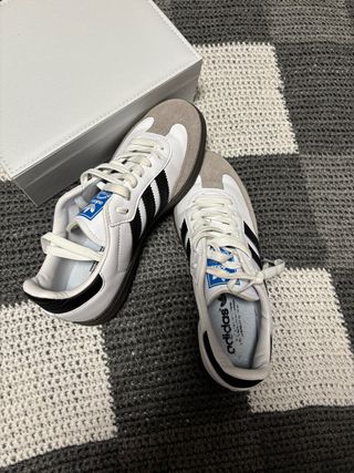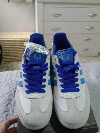 Zapatillas Adidas Samba edición limitada, diseñadas en colaboración con Messi. - Diseño exclusivo con detalles en azul y blanco. - Logo de Messi en el lateral. - Suela de goma. - Cierre de cordones.