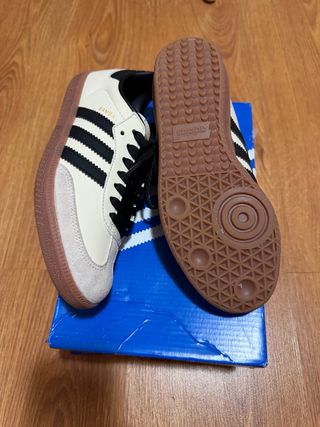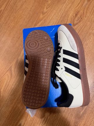 Zapatillas Adidas Samba OG en talla 39 1/3. Un clásico atemporal con un diseño icónico. Modelo y colores unisex. Nuevas en su caja, por error de talla. - Parte superior de cuero y ante. - Tres rayas características de Adidas en blanco. - Suela de goma marrón. - Detalle de SAMBA en dorado.