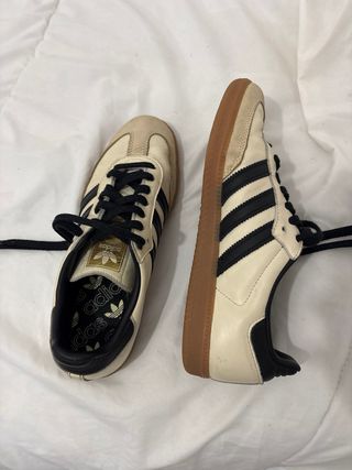 Zapatillas Adidas Samba con un diseño clásico y moderno. - Parte superior de cuero blanco. - Rayas laterales negras. - Suela de goma marrón. - Detalle de costuras. Calzan pequeñas mas bien para un 35