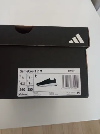 Zapatillas deportivas Adidas GameCourt 2 M. Compradas por error , pequeñas,. No se pueden devolver, se pasó el plazo. Conservamos ticket de compra, son originales...precio actual 70€. Posibilidad de entrega en Huesca y Zaragoza - Modelo: IG9567 - Talla UK: 7.5 - Talla F: 41 1/3 - Talla CHN: 255 - Diseñadas para tenis. - Fabricadas en Vietnam.