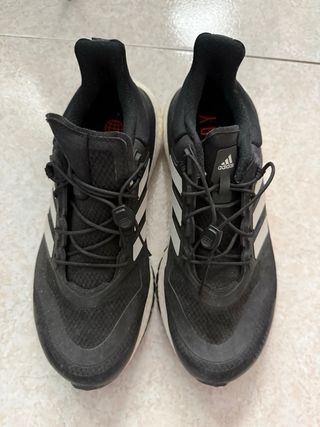 Zapatillas deportivas Adidas Solar Boost 3M. - Diseño en blanco con detalles en naranja. - Logo de Adidas en los laterales. - En su caja original - Amortiguadas y con placa que la hace reactiva, se puede ver en la suela y en zona antepie en el lateral de la suela. Una pasada de zapatilla.