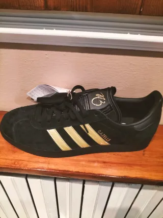Zapatillas Adidas Gazelle con un diseño clásico y elegante. - Parte superior de ante negro. - Detalle de las tres rayas doradas. - Logo de Gazelle en el lateral. - Sin estrenar. - Con envoltorio y etiquetas originales.