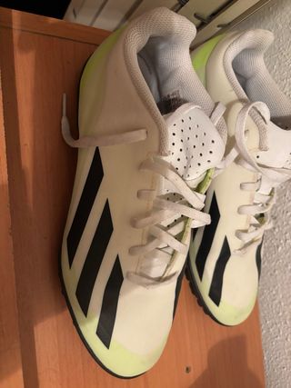 Vendo zapatillas Adidas de fútbol para jóvenes. Están en buen estado y son ideales para jugar. - Son de color blanco y negro. - Ideales para practicar deportes. - Talla: consultar en la imagen. solo se ha usado dos veces