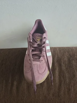 Zapatillas deportivas Adidas Gazelle con un diseño clásico y cómodo. Número 38 pero es como un 39, se la regalaron a mi hija y le quedan grandes - Exterior de gamuza en tono rosa. - Detalle de las tres franjas blancas. - Refuerzo en el talón de color blanco. - Suela de goma en color caramelo.