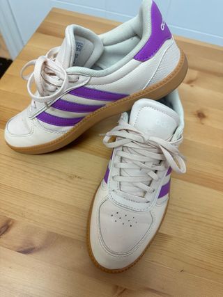 Zapatillas deportivas de mujer con un diseño moderno y cómodo. - Combinación de colores beige y morado. - Detalle de las tres rayas icónicas de Adidas. - Suela de goma resistente.