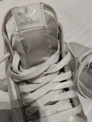 Zapatillas altas de la marca Adidas con un acabado brillante. - Color plateado y blanco. - Cordones blancos. - Detalle del logo de Adidas en los laterales.Cordones de repuesto