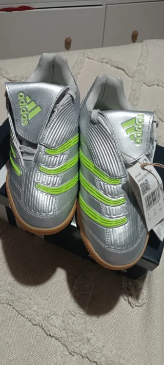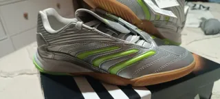 Zapatillas de fútbol sala Adidas Originals Predator en color plateado con detalles en verde. Talla 38. Nuevas. con etiqueta y en caja. - Diseño con tres rayas. - Suela de goma.