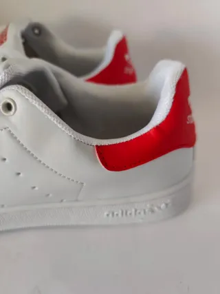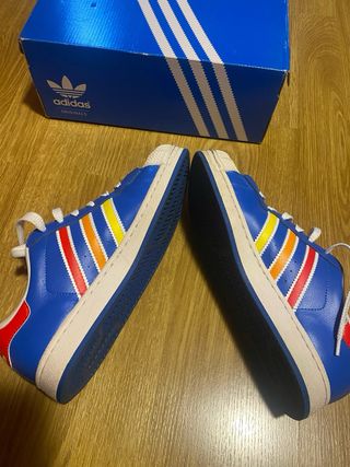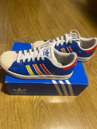 Zapatillas Adidas Superstar en muy buen estado. Un clásico con un diseño vibrante. - Diseño con tres rayas laterales en colores (amarillo, naranja, rojo, azul). - Puntera de goma característica. - Cierre con cordones blancos. - Detalle de color rojo en el talón.