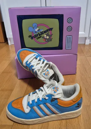 Zapatillas deportivas Unisex Adidas con un diseño inspirado en The Itchy & Scratchy Show. - Combinación de colores azul y naranja. - Detalle de personaje en el lateral. - Logo de Adidas en la suela. - Tiene un cordón blanco y otro azul nuevos