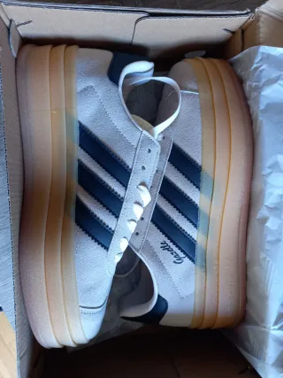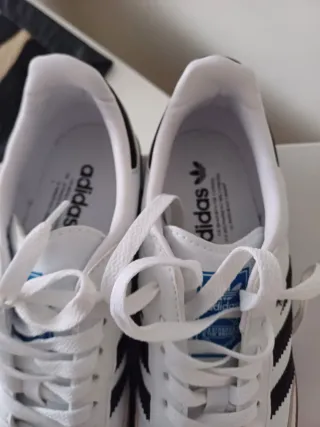 Zapatillas Adidas Gazelle originales en excelente estado, casi nuevas. Solo se usaron una vez. Son preciosas y me encantan, pero debido a una lesión en el pie no se ajustan correctamente y no me resultan cómodas. Combinan un diseño clásico con detalles modernos y están impecables. - Exterior de ante negro. - Rayas laterales blancas. - Detalle de logo en la lengüeta.