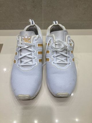 Zapatillas deportivas Adidas en color blanco con detalles dorados. - Diseño moderno y ligero. - Cierre con cordones. - Logo de Adidas en la lengüeta.